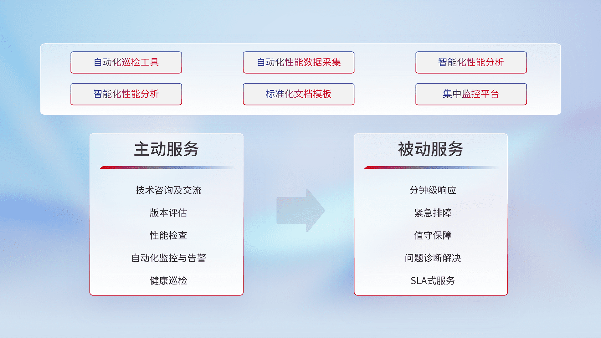 智能化工具和标准化文档,,保障服务质量,,提供主动服务(包含技术咨询、、、、版本评估、、、性能检查、、自动化监控与告警、、、、健康巡检)和被动服务包含(分钟级响应、、、紧急排障、、、值守保障、、、、问题诊断解决、、、、SLA服务)。。。。